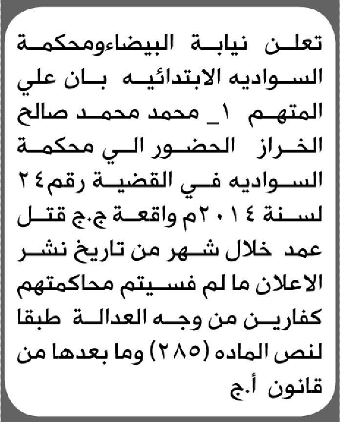 تعلن نيابة البيضاء ومحكمة السوادية أن على المتهم محمد الخراز الحضور إلى المحكمة