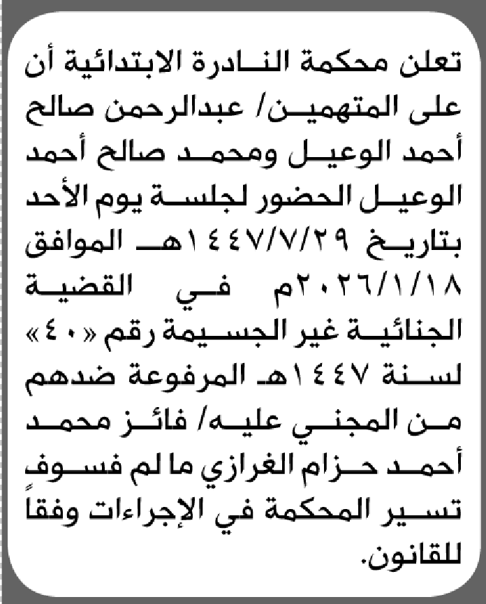 تعلن محكمة النادرة أن على المتهمين عبدالرحمن ومحمد الوعيل الحضور إلى المحكمة