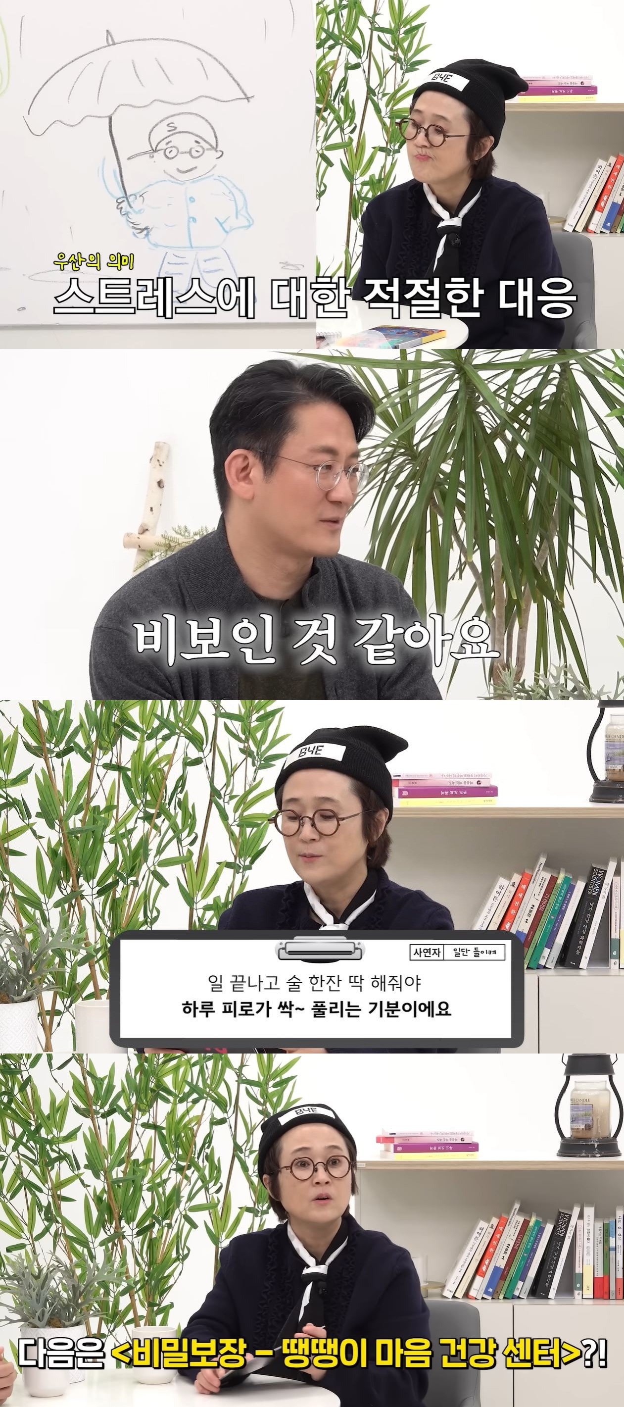 코미디언 송은이가 자기보다 회사를 더 생각한다는 검사 결과를 받았다. 그는 지난 15일 유튜브 채널 ‘비보티비(VIVO TV)’에 올라온 영상에서 대표로 있는 회사 미디어랩시소에 입사한 정신과 전문의 이광민고 사연을 읽었다.앞서 송은이는 비 오는 날의 사람이란 주제로 그림 검사를 시작했다.이광민은 “우산을 쓰고 있는 사람은 대표님인데 큰 우산을 쓰고 있어서 스스로에 대한 자기 보호를 잘 하고 계신 것”이라고 말했다.그는 “그림 그린 순서로 나무를 먼저 그렸는데 약간 뭉클했다”며 “이 나무가 상징하는 게 회사인 것 같다. 나무는 타인을 위한 건데 이걸 먼저 생각하셨다”고 했다.이어 송은이는 회사 직원이 보낸 “술 안 먹는다고 손이 떨리거나 잠이 안 오는 거 아닌데 매일 마신다. 혹시 알콜 중독인 게 아니냐”는 사연을 읽었다.이광민은 “이 술을 통해서 그 다음날 활기차게 일을 지속할 수 있다면 이건 필요악”이라며 “우울할 때 술로 푸는 게 제일 안 좋다”고 말했다.송은이는