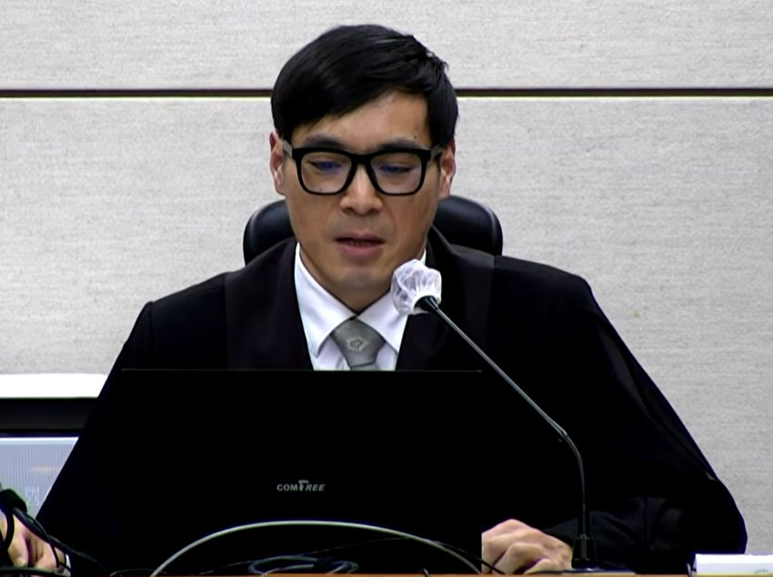 “피고인 입정하십시오.”16일 오후 2시 1분 서울중앙지법 311호 중법정. 서울중앙지법 형사합의35부의 재판장인 백대현 부장판사의 말이 끝나자 곤색 양복에 노타이차림의 윤석열 전 대통령이 재판장에 한 차례 인사한 뒤 자리로 걸어들어갔다. 그는 걸어들어가면서 또 한 차례에 고개를 꾸벅 숙인 후 자리에 착석했다. 이날 선고는 법정에 설치된 카메라를 통해 TV로 생중계되고 있다. 전직 대통령에 대한 1심 판결 선고 장면이 생중계되는 건 박근혜·이명박 전 대통령에 이어 이번이 세 번째다. 다만 앞선 두 전직 대통령과 달리 윤 전 대통령은 선고공판에 직접 출석했다. 백 부장판사는 이날 오후 2시 2분경부터 윤 전 대통령에 대한 8개 혐의에 대한 유무죄 판단을 설명했다. 2시 55분경엔 양형 이유를 설명하고, 6분 뒤인 3시 1분경 “피고인 일어서십시오”라고 말한 뒤 주문을 읽었다. 약 59분에 걸쳐 빠른 속도로 쉼없이 판결문을 읽어내려간 백 부장판사는 주문을 읽을 때는 9차례에 걸쳐 윤