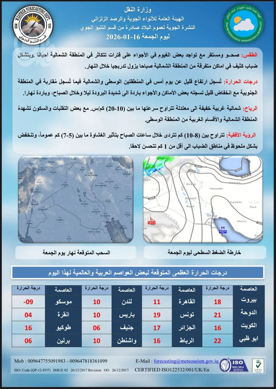 بغداد/المدى أعلنت هيئة الأنواء الجوية، اليوم الجمعة، حالة طقس العراق خلال الأيام المقبلة. The post طقس العراق: غائم جزئياً مع أمطار شمالاً appeared first on جريدة المدى .
