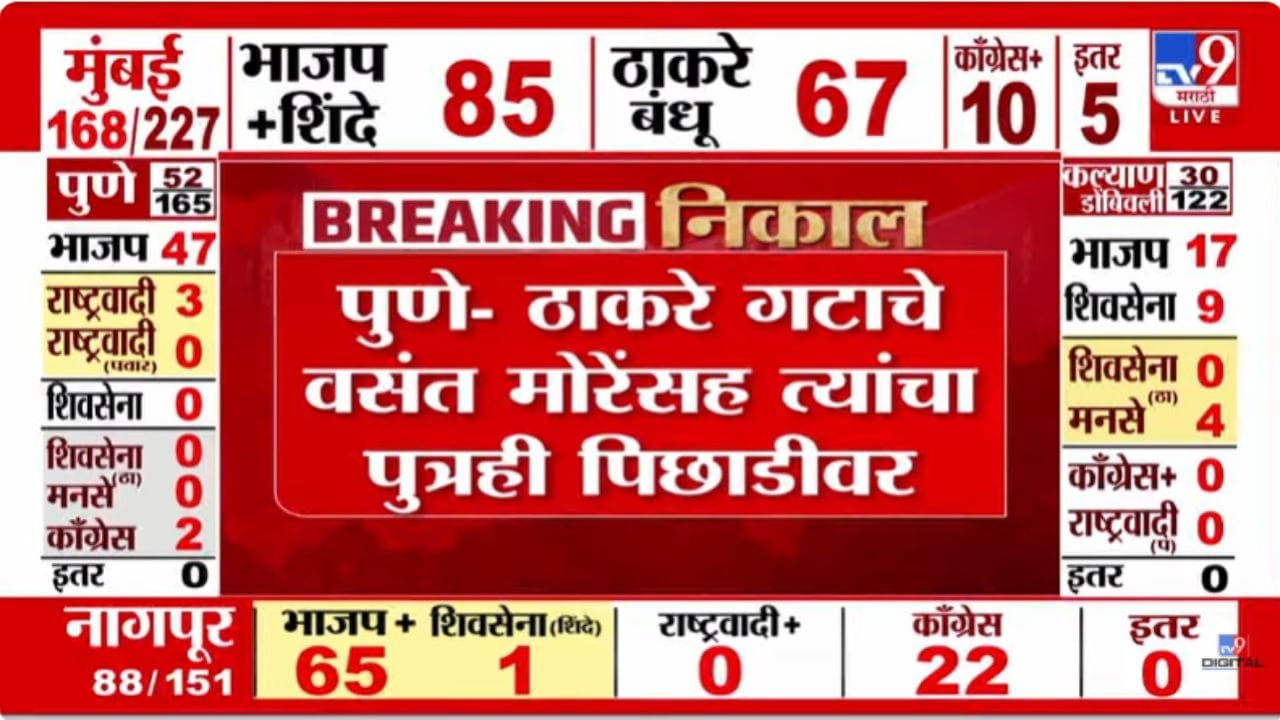 महाराष्ट्र स्थानिक स्वराज्य संस्था निवडणूक २०२६ च्या निकालांमध्ये पुण्यात ठाकरे गटाचे वसंत मोरे आणि त्यांचे पुत्र पिछाडीवर आहेत. मुंबईतील प्रभाग ८७ मध्ये भाजपचे कृष्णा पारकर आघाडीवर आहेत, तर प्रभाग १८३ मधून काँग्रेसच्या आशा काळे विजयी झाल्या आहेत. माजी महापौर मिलिंद वैद्य यांनी वॉर्ड १८२ जिंकला असून, मुंबईतील प्रभाग १०३ मधून भाजपच्या हेतल गाला आघाडीवर आहेत.