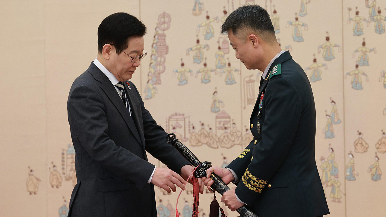 ▲ 이재명 대통령이 16일 청와대 본관에서 열린 3성 장군 진급·보직 신고 및 수치 수여식에서 박성제 특수전사령관의 삼정검에 수치를 …