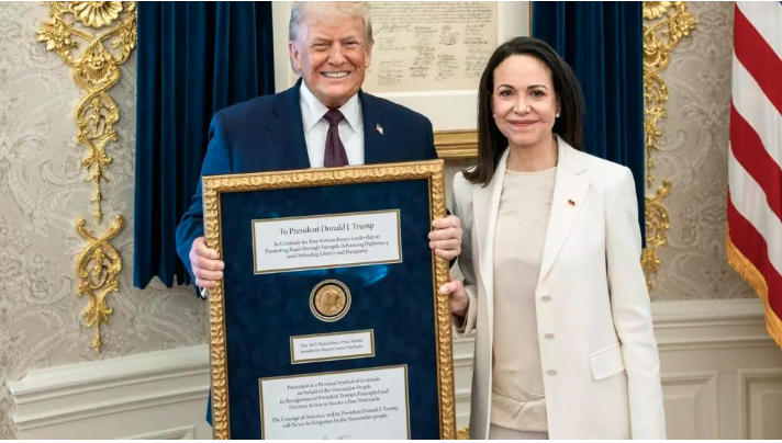 قدّمت زعيمة المعارضة الفنزويلية ماريا كورينا ماتشادو ميدالية جائزة نوبل للسلام إلى الرئيس الأمريكي دونالد ترمب، يوم الخميس، خلال لقاء جمعهما في البيت الأبيض. وأكد مسؤول في البيت الأبيض أن الرئيس الأمريكي يعتزم الاحتفاظ بالميدالية. وكتب ترمب في منشور على مواقع التواصل الاجتماعي: «منحتني ماريا جائزة نوبل للسلام تقديرًا للعمل الذي قمت به. إنها لفتة [...] تم نشر هذه المقالة المعارضة الفنزويلية ماتشادو تهدي ترمب ميدالية نوبل للسلام للمرة الأولي علي صحيفة الوئام .