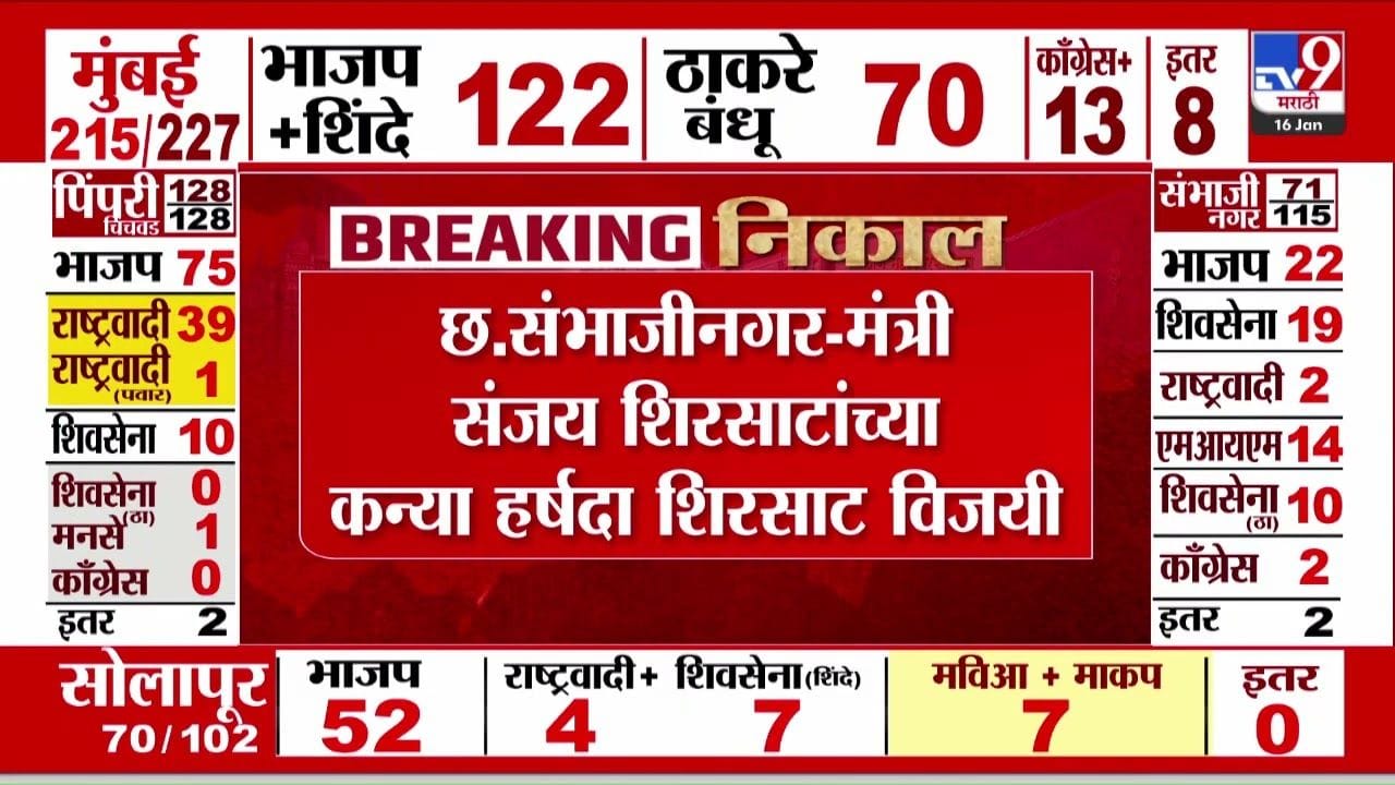 छत्रपती संभाजीनगरमध्ये मंत्री संजय शिरसाट यांच्या कन्या हर्षदा शिरसाट यांनी २०२६ च्या स्थानिक निवडणुकीत विजय मिळवला आहे. पहिल्यांदाच रिंगणात उतरलेल्या हर्षदा यांच्या विजयाने शिरसाट कुटुंबाची राजकीय परंपरा पुढे नेली आहे. शहरात भाजप २२, शिवसेना १९, एमआयएम १४, आणि ठाकरे गट १० जागांवर आघाडीवर आहेत.