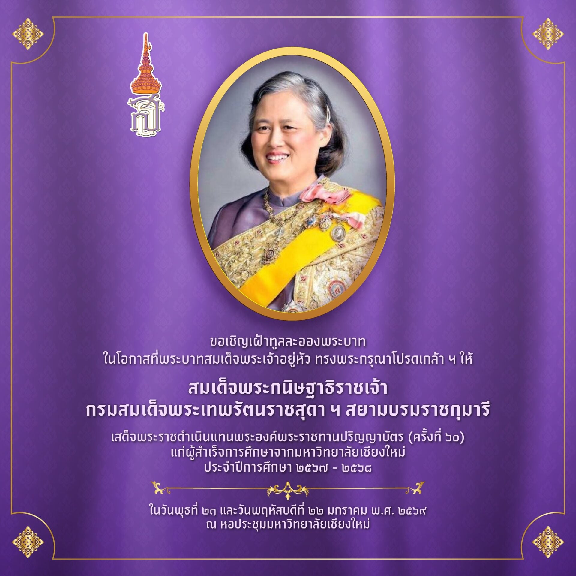 พระบาทสมเด็จพระเจ้าอยู่หัว ทรงพระกรุณาโปรดเกล้าโปรดกระหม่อม ให้ สมเด็จพระกนิษฐาธิราชเจ้า กรมสมเด็จพระเทพรัตนราชสุดาฯ สยามบรมราชกุมารี เสด็จพระราชดำเนินแทนพระองค์ พระราชทานปริญญาบัตรแก่ผู้สำเร็จการศึกษาของมหาวิทยาลัยเชียงใหม่ ในพิธีพระราชทานปริญญาบัตรมหาวิทยาลัยเชียงใหม่ ครั้งที่ 60 ประจำปีการศึกษา 2567–2568 ระหว่างวันพุธที่ 21 และวันพฤหัสบดีที่ 22 มกราคม พุทธศักราช 2569 ณ หอประชุมมหาวิทยาลัยเชียงใหม่ The post มหาวิทยาลัยเชียงใหม่ จัดพิธีพระราชทานปริญญาบัตร ครั้งที่ 60 ในวันที่ 21-22 มกราคม 2569 appeared first on .