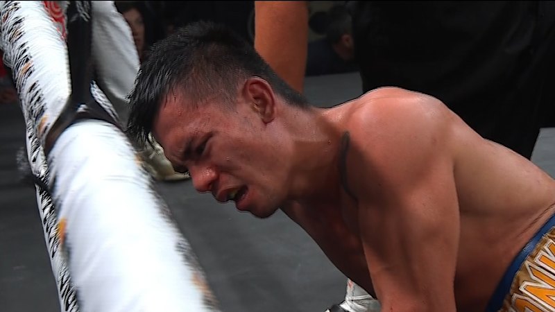 Liam Wilson delivers a brutal body blow to knock down Rodex Piala.