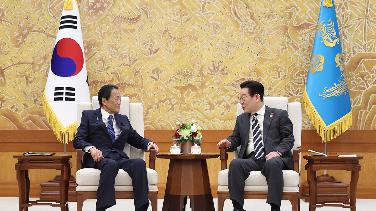▲ 이재명 대통령이 16일 청와대에서 아소 다로 전 일본 총리를 접견하고 있다.이재명 대통령은 오늘 오후 청와대에서 아소 다로 전 일…
