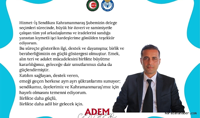 Hizmet-İş Sendikası Kahramanmaraş Şube Başkan Adayı Adem Cevher, bazı haber kanalları ve sosyal medya mecralarında yer alan “seçimi kazandık” yönündeki paylaşımlar üzerine kamuoyunu doğru bilgilendirmek amacıyla açıklamada bulundu.