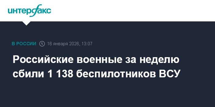 Российские средства ПВО за неделю сбили 1 138 беспилотников ВСУ, три ракеты большой дальности "Нептун" и 31 управляемую авиабомбу, сообщает министерство обороны РФ."Средствами противовоздушной обороны сбиты 31 управляемая авиационная бомба, 21 реактивный снаряд системы залпового огня HIMARS производства США, три управляемые ракеты большой дальности "Нептун" и 1 138 беспилотных летательных аппаратов самолетного типа", - сказано в сообщении Минобороны, распространённом в пятницу.
