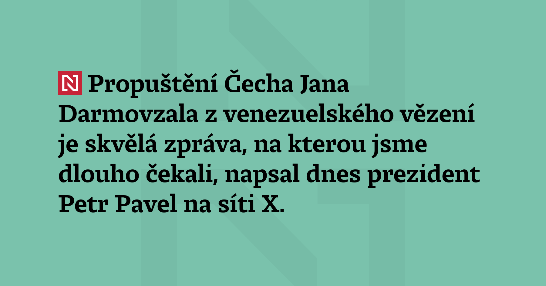 Propuštění Čecha Jana Darmovzala z venezuelského vězení je skvělou zprávou, na kterou jsme dlouho čekali, uvedl dnes prezident Petr Pavel na síti X. „Jeho případem se dlouhé měsíce zabývalo mnoho expertů u nás v Česku i řada zahraničních partnerů, které jsme průběžně oslovovali, včetně USA a Evropské unie,“ napsal také. (X)