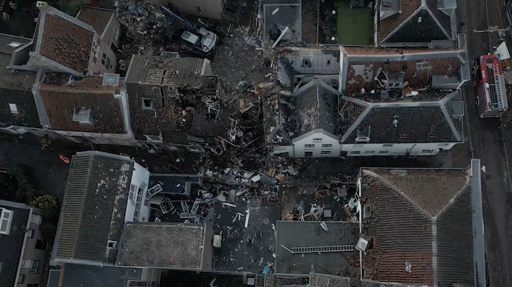 De schade na de explosie in Utrecht is vanochtend goed te zien vanuit de lucht.