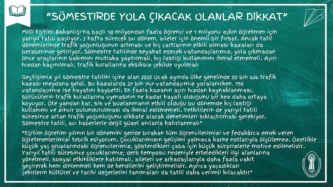 Yarıyıl tatilinin başlamasıyla birlikte milyonlarca aile de yollara çıkmaya hazırlanıyor. Türkiye Esnaf ve Sanatkârları Konfederasyonu (TESK) Genel Başkanı Bendevi Palandöken, tatil dönemlerinde artan trafik yoğunluğuna ve kış şartlarının oluşturduğu risklere dikkat çekerek, sürücülerin araç bakımlarını yaptırmaları, kış lastiği kullanmaları ve trafik kurallarına titizlikle uymaları gerektiğini vurguladı.