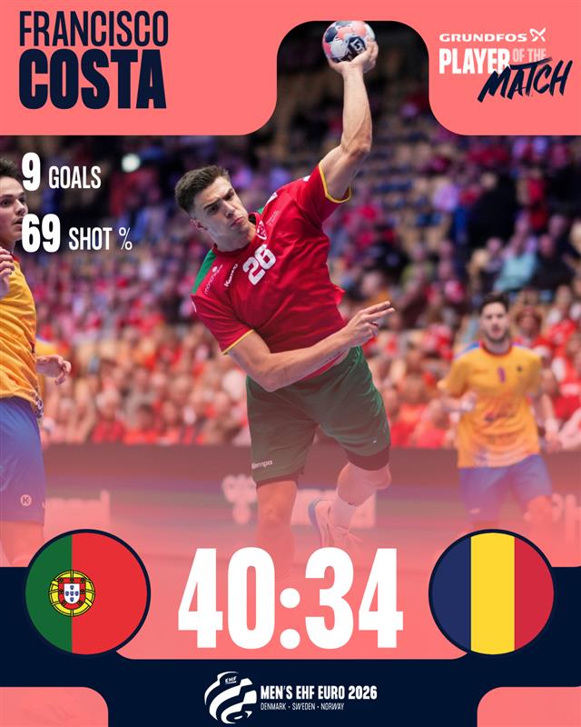 Португалија рутински ја совлада вечерва Романија со 40-34 и со победа го почна настапот на Европското првенство во групата Б во која во недела ќе игра против македонската репрезентација. Натпреварот во Хернинг беше резултатски неизвесен само во воведните десет минути, по што Португалците со две серија од 6-0 и 6-1 стекнаа висока предност на полувремето (23-15), која ја зачуваа до самиот крај. Воведното коло во групата Б ќе биде комплетирано вечерва по дуелот во кој македонската репрезентација ќе игра против кодомаќинот на Европското првенство, Данска. Стартни победи вечерва забележаа и Исланд против Италија (39-26) во рамки на групата Ф и Словенија која во воведниот дуел во групата Д ја совлада Црна Гора со 41-40.