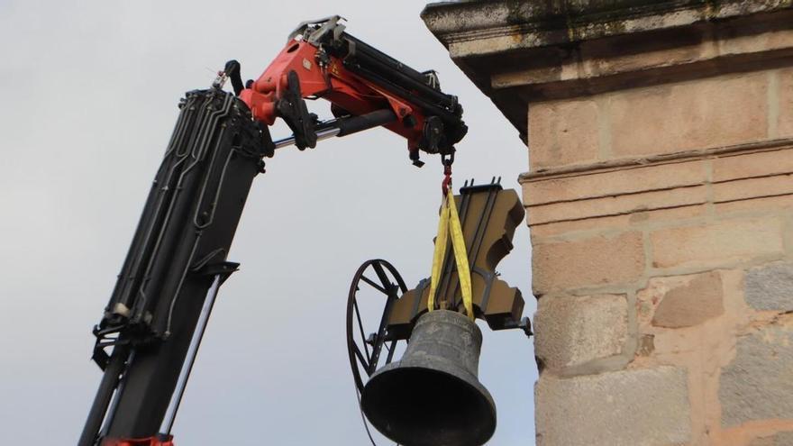 Una grúa ha bajado de la torre una de las campanas de la iglesia de San Juan Bautista para ser restaurada. Una operación de precisión que ha sido seguida de cerca por el párroco, Pedro Castelo, y el alcalde de Hinojosa, Matías González, junto varios concejales y un nutrido grupo de vecinos.