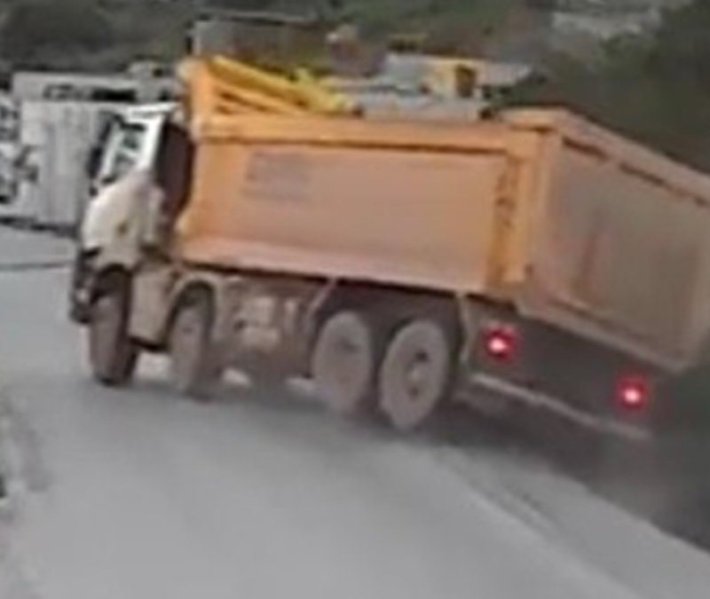 Muğla'da yol kenarındaki çukura giren hafriyat kamyonunun devrildiği anlar güvenlik kamerasına yansıdı. Yolun trafiğe kapandığı kazada 1 kişi yaralandı.