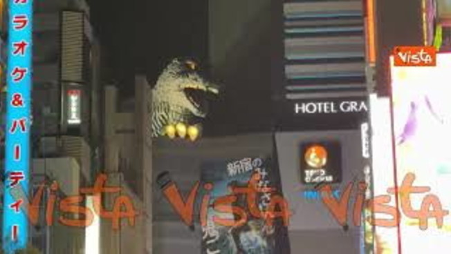 (Agenzia Vista) Roma, 16 gennaio 2026 La testa di Godzilla sporge dall'edificio del cinema Toho di Tokyo e ruggisce a orari prestabiliti. Fonte: Agenzia Vista / Alexander Jakhnagiev