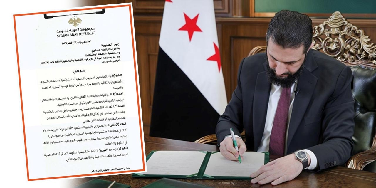 Suriye Devlet Başkanı Ahmed Şara, Suriye’deki Kürt halkının haklarının anayasal güvence altına alınacağını ve Kürt kimliğini Suriye ulusal kimliğinin asli bir parçası olarak tanınacağını belirten 13 Sayılı Kararname’yi imzaladı.