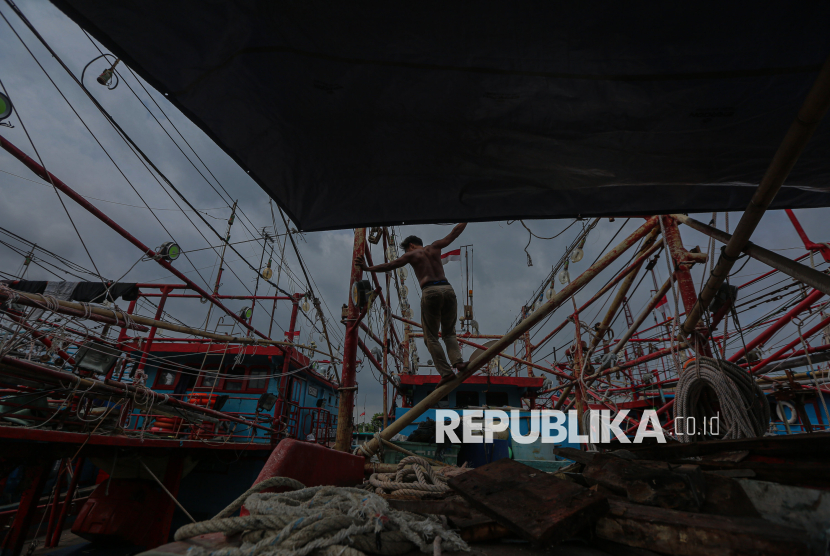 REPUBLIKA.CO.ID, JAKARTA -- Nelayan memperbaiki kapal di Pelabuhan Muara Baru, Jakarta Utara, Jumat, (16/1/2026). Sejumlah nelayan menghentikan aktivitas melautnya karena cuaca ekstrem yang memicu gelombang tinggi di perairan. Kondisi tersebut dipengaruhi...