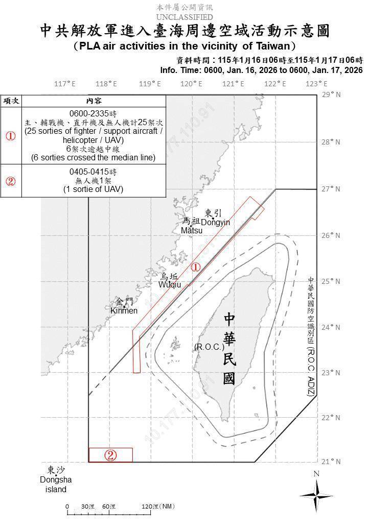 中國持續對台軍事施壓。國防部今天(17日)持續表示,自昨(16日)日上午6時至今天上午6時止,偵獲中共軍機26架次、共艦8艘及公務船1艘,持續在台海周邊活動。其中有7架次軍機逾...…