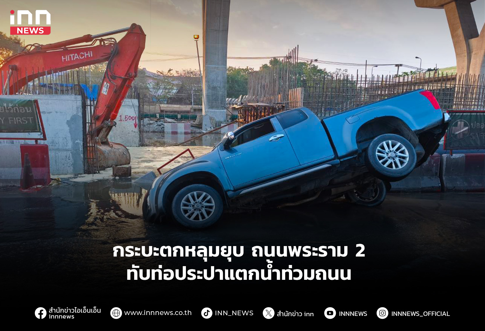 รถกระบะตกหลุมยุบถนนพระราม 2 ทับท่อประปาแตกน้ำท่วมถนน