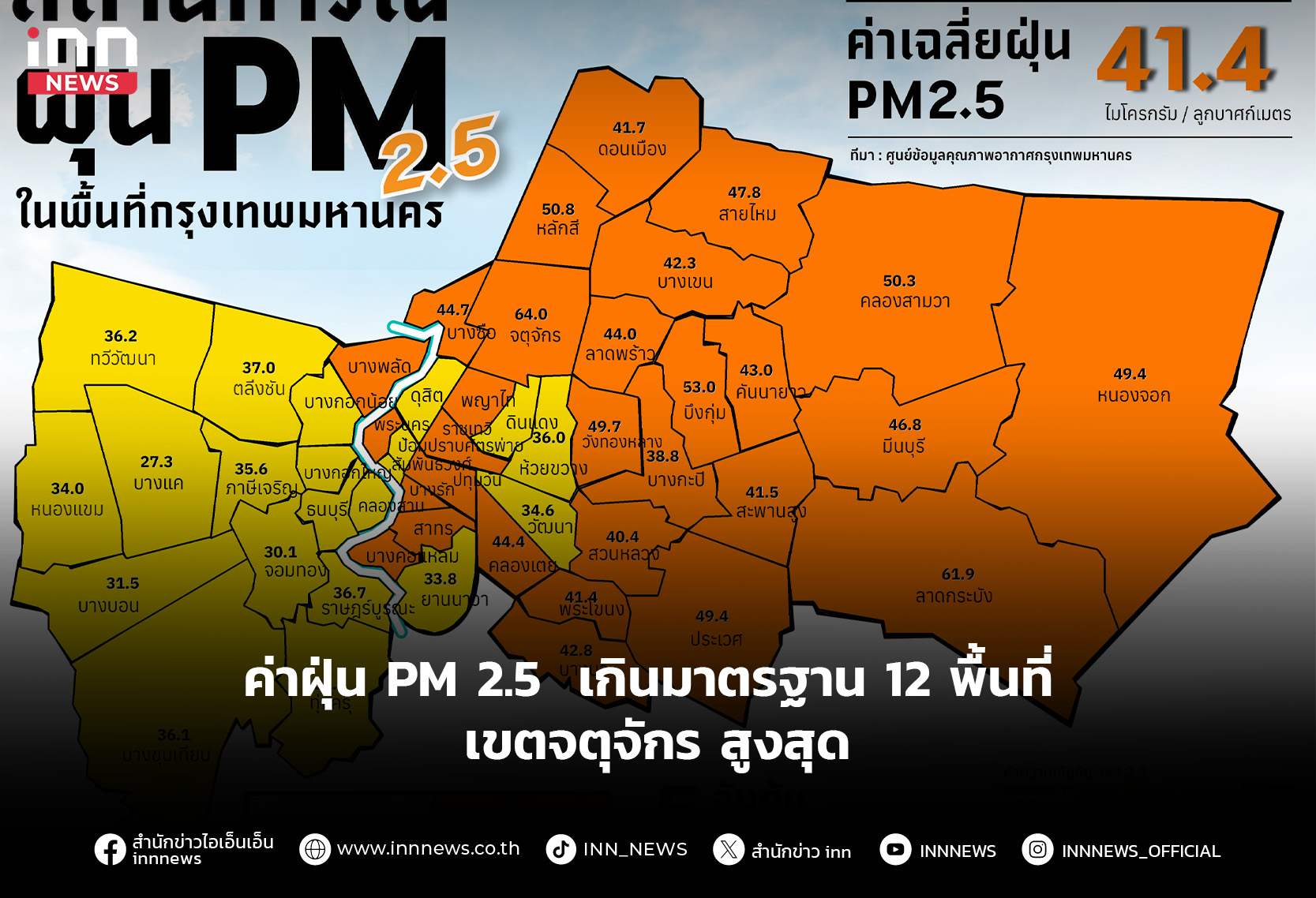 กทม.เผย ค่าฝุ่น PM 2.5 เกินมาตรฐาน 12 พื้นที่ สูงสุด เขตจตุจักร 64 มคก./ลบ.ม.