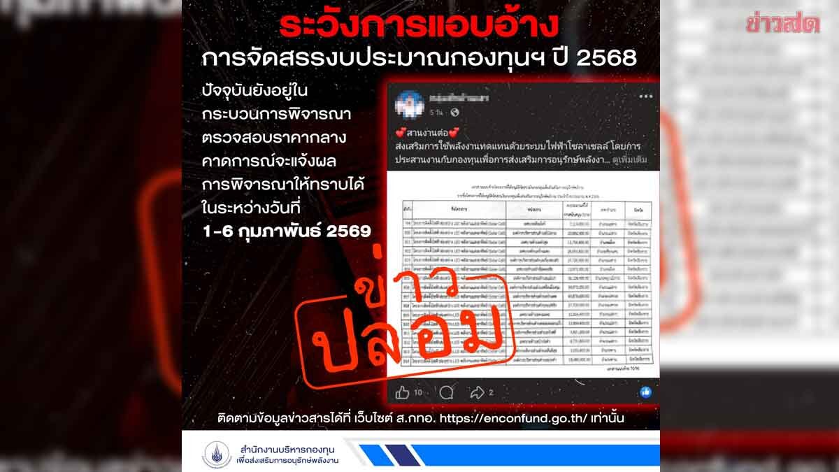 กองทุนอนุรักษ์ฯ แจ้งเตือน หน่วยงานที่ยื่นขอรับจัดสรรงบประมาณปี 2568 ระวังผู้แอบอ้างข้อมูลโครงการและงบประมาณว่า ได้รับการอนุมัติแล้ว ยืนยันปัจจุบันยังอยู่ระหว่างพิจารณา นายรัฐฉัตร ศิริพานิช ผู้จัดการสำนักงานบริหารกองทุนเพื่อส่งเสริมการอนุรักษ์พลังงาน (ส.กทอ.) เปิดเผยว่า ขณะนี้มีกลุ่มผู้แอบอ้างกับหน่วยงานที่ยื่นขอรับจัดสรรงบประมาณกองทุนเพื่อส่งเสริมการอนุรักษ์พลังงาน ประจำปี 2568 ว่าโครงการที่ยื่นมานั้นได้รับการอนุมัติแล้ว โดยมีการนำรายชื่อโครงการ ชื่อหน่วยงาน และงบประมาณไปแอบอ้างเพื่อสร้างความน่าเชื่อถือ กองทุนขอยืนยันว่าเอกสารหรือการแจ้งผลดังกล่าวเป็นการแอบอ้างเท่านั้น และขอให้ข้อเท็จจริง ดังนี้ – สถานการณ์ดำเนินงาน ปัจจุบันโครงการที่ได้รับการอนุมัติ อยู่ระหว่างกระบวนการพิจารณาตรวจสอบราคากลาง โดยคณะอนุกรรมการฯ ตามมติคณะกรรมการกองทุน – กำหนดการประกาศผล คาดการณ์ว่าจะสามารถประกาศผลการพิจารณาอย่างเป็นทางการได้ในระหว่างวันที่ 1-6 ก.พ.2569 – การแจ้งผลทางการ กองทุนจะดําเนินการส่งหนังสือแจ้งผลให้ผู้ขอรับการสนับสนุนของหน่วยงานทราบเป็นลายลักษณ์อักษร และจะเผยแพร่ผลการพิจารณาผ่านเว็บไซต์ทางการของกองทุน เท่านั้น – ช่องทางติดตามข้อมูล สามารถตรวจสอบผลการอนุมัติได้ที่เว็บไซต์ทางการของกองทุนเท่านั้น https://enconfund.go.th/ “ขอย้ำให้หน่วยงานหรือองค์กรต่างๆ อย่าได้หลงเชื่อผู้แอบอ้างว่าโครงการของท่านผ่านการอนุมัติแล้ว และขอให้ติดตามข้อมูลผ่านช่องทางที่เป็นทางการของกองทุนเพื่อความถูกต้องและชัดเจน”