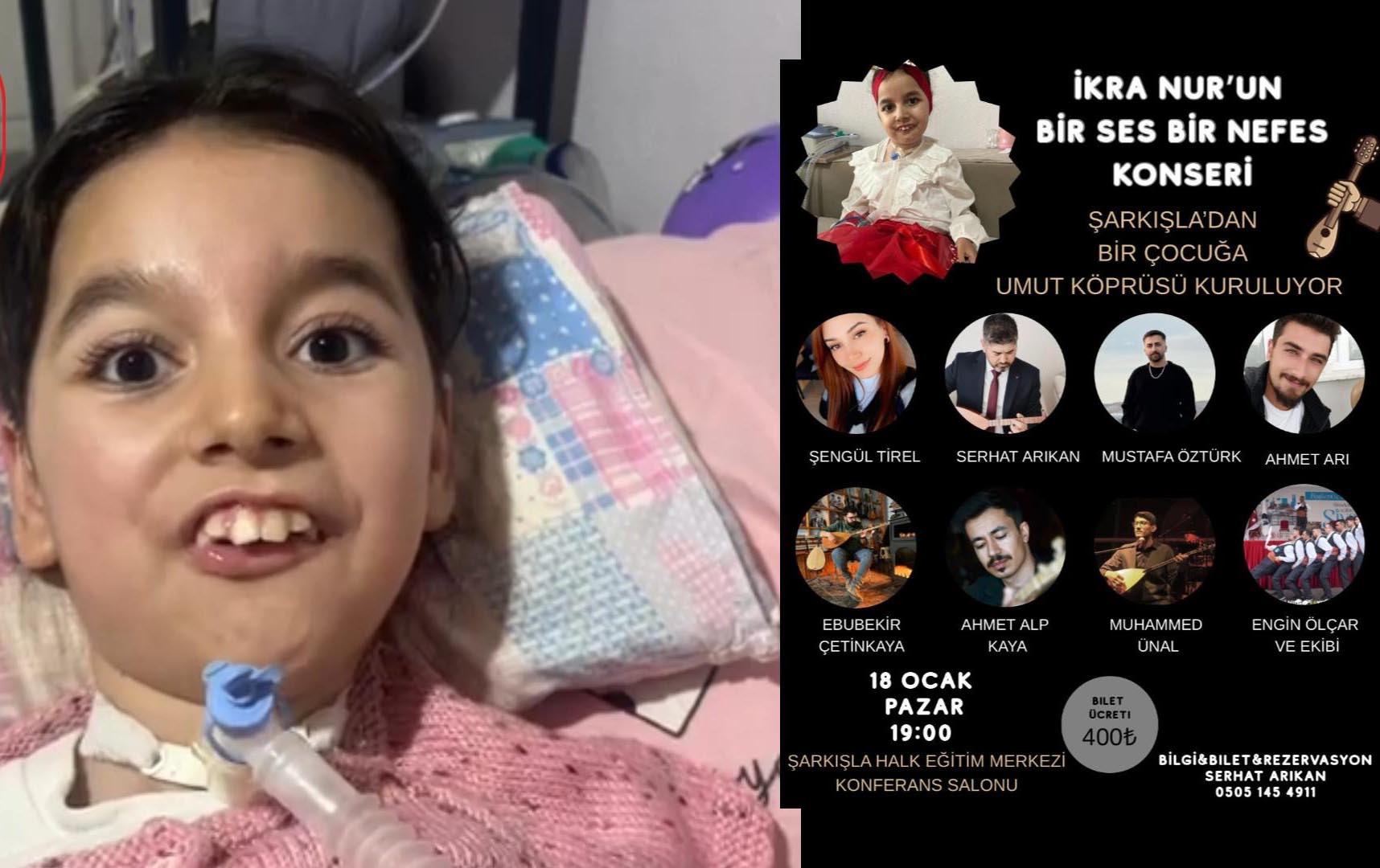Sivas’ın Şarkışla ilçesinde, SMA Tip-1 hastası 10 yaşındaki İkra Nur Alsat’ın tedavisine destek olmak amacıyla gönüllü müzisyenlerin sahne alacağı “Bir Ses Bir Nefes” dayanışma konseri düzenlenecek.