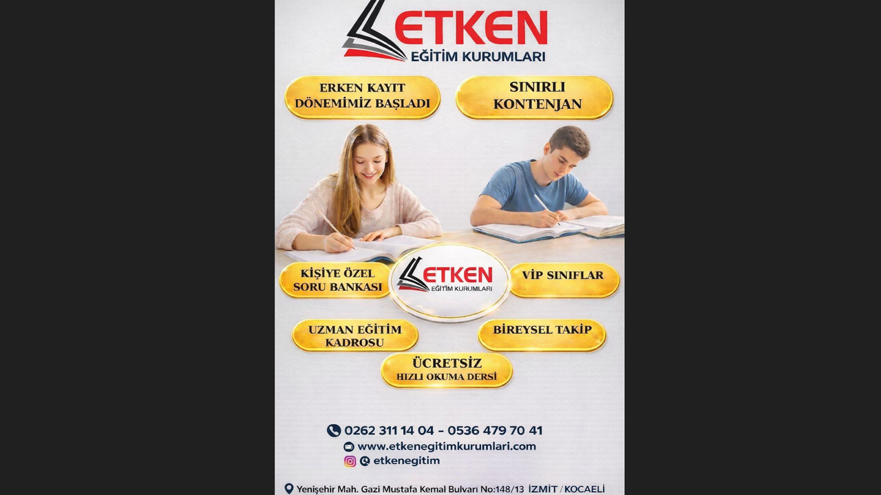 İzmit’te faaliyet gösteren Etken Eğitim Kurumları, sınırlı kontenjanla erken kayıt dönemini başlattığını duyurdu. Kurum, kişiye özel eğitim modeliyle öğrencilere bireysel takip imkânı sunuyor.