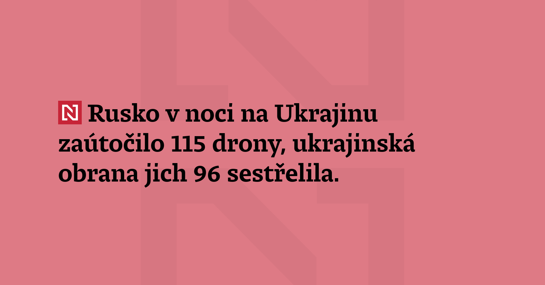 Rusko v noci na Ukrajinu zaútočilo 115 drony, ukrajinská obrana jich 96 sestřelila. Zasaženo bylo 11 míst, žádné zraněné úřady nehlásí. (Ukrajinska pravda)