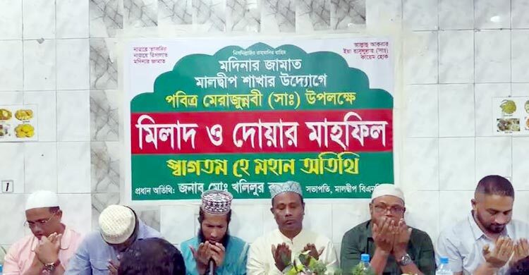 মালদ্বীপে মদিনা জামায়াতের উদ্যোগে বৃহস্পতিবার স্থানীয় সময় রাত ৯টা ৩০ মিনিটে রাজধানী মালে একটি রেস্টুরেন্টে ধর্মীয় ভাবগাম্ভীর্য ও যথাযোগ্য মর্যাদায় পবিত্র মেরাজুন্নাবী (সাল্লাল্লাহু আলাইহি ওয়া সাল্লাম) উদযাপন করা হয়েছে। অনুষ্ঠানে প্রধান অতিথি হিসেবে উপস্থিত ছিলেন মালদ্বীপ বিএনপির সভাপতি খলিলুর রহমান। বিশেষ অতিথি হিসেবে উপস্থিত ছিলেন মালদ্বীপ বিএনপির সিনিয়র সহ-সভাপতি নেহের মিয়া রানা, সহ-সভাপতি আলতাফ হোসেন, মোহাম্মদ ফারুক, সহ-সভাপতি, এমরান হোসেন তালুকদার, যুগ্ম সাধারণ সম্পাদক শরিফুল ইসলাম, যুগ্ম সাধারণ সম্পাদক রবিউল আলম, সাংবাদিক মাহামুদুল, প্রচার সম্পাদক খলিলুর রহমান, সহ-প্রচার সম্পাদক পিয়াস। এ সময় বিএনপি ও সহযোগী সংগঠনের অন্যান্য নেতা, পিন্ট ও ইলেকট্রনিক মিডিয়ার সাংবাদিক এবং মালদ্বীপে বসবাসরত প্রবাসী বাংলাদেশিরা উপস্থিত ছিলেন। অনুষ্ঠান সভাপতিত্ব করেন আলহাজ আলমগীর হোসেন। আলোচনা সভায় পবিত্র মেরাজের শিক্ষা, নামাজের গুরুত্ব এবং রসুলুল্লাহর (সা.)-এর আদর্শ অনুসরণের ওপর গুরুত্বারোপ করা হয়। সম্পূর্ণ অনুষ্ঠানটি সঞ্চালনা করেন মালদ্বীপ মদিনা জামায়াতের সভাপতি ও সাংবাদিক মোহাম্মদ আলামিন। শেষে দেশ, জাতি ও মুসলিম উম্মাহর শান্তি, সমৃদ্ধি ও কল্যাণ কামনায় বিশেষ দোয়া ও মোনাজাত করা হয়। এমআরএম/জেআইএম