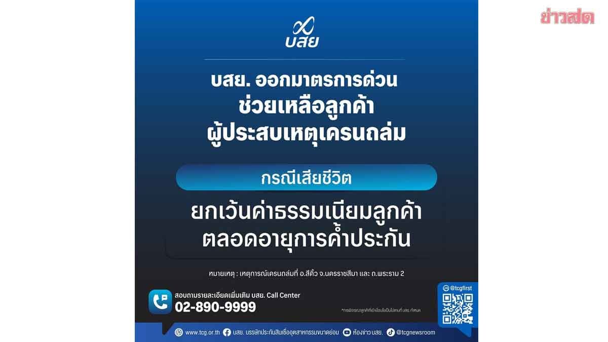 บรรษัทประกันสินเชื่ออุตสาหกรรมขนาดย่อม (บสย.) ออกมาตรการด่วน เยียวยาลูกค้าค้ำประกันสินเชื่อ เหตุเครนถล่มสีคิ้ว–พระราม 2 ยกเว้นค่าธรรมเนียมตลอดอายุค้ำ นายสิทธิกร ดิเรกสุนทร กรรมการและผู้จัดการทั่วไป บรรษัทประกันสินเชื่ออุตสาหกรรมขนาดย่อม (บสย.) เปิดเผยว่าจากเหตุเครนที่ใช้ก่อสร้างทางรถไฟความเร็วสูงตกทับขบวนรถไฟขบวนด่วนพิเศษ ขบวน 21 กรุงเทพฯ – อุบลราชธานี ที่บริเวณบ้านถนนคต อ.สีคิ้ว จ.นครราชสีมา และถนนพระราม 2 ส่งผลให้มีผู้เสียชีวิตและบาดเจ็บเป็นจำนวนมาก บสย. พร้อมเคียงข้างลูกค้าที่ประสบเหตุดังกล่าวอย่างเต็มที่ ล่าสุด บสย. ได้ออก “มาตรการด่วน” เพื่อเยียวยาลูกค้า ที่ บสย. ค้ำประกันสินเชื่อ กรณีเสียชีวิต ยกเว้นค่าธรรมเนียมลูกค้า ตลอดอายุการค้ำประกัน เพื่อลดภาระทางการเงินให้แก่ครอบครัวผู้สูญเสีย สามารถสอบถามข้อมูลเพิ่มเติม และรายละเอียดการเข้าร่วมมาตรการ ได้ที่สำนักงานเขตในพื้นที่ และ บสย. Call Center โทร. 02-890-9999