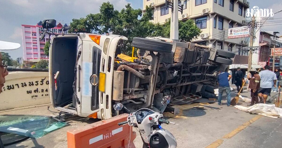 หวิดตกคลอง หกล้อบรรทุกเครน เสียหลักคว่ำบนสะพานนรรัตน์สถาน เจ็บ 2 หามส่งรพ.