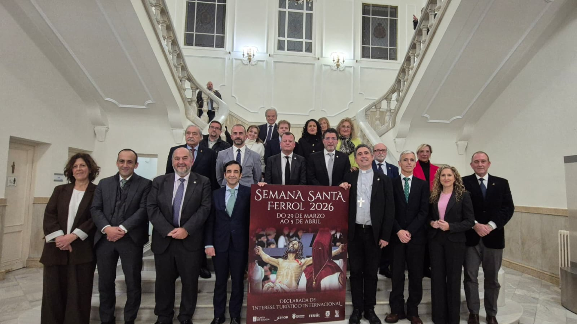 La Junta General de Cofradías y Hermandades de la Semana Santa de Ferrol ha presentado este viernes, 16 de enero, en el salón de recepciones del Ayuntamiento, el cartel oficial para la edición de 2026. La imagen promocional está protagonizada por el Cristo Redentor de la Cofradía de la Merced, coincidiendo con el centenario de la inauguración de su capilla y de la llegada de la talla del imaginero José Rivas a la ciudad. La fotografía, realizada por Ignacio del Moral "Inaxete", marca el inicio de la cuenta atrás para unas procesiones que este año se desarrollarán entre el 29 de marzo (Domingo de Ramos) y el 5 de abril (Pascua de Resurrección). Durante el acto, el presidente de la Junta de Cofradías, Fernando Iguacel Selle, destacó que el cartel es un "anticipo del sentimiento y la fe" que recorre las calles de Ferrol cada año. Por su parte, la hermana mayor de la Cofradía de la Merced, Helena Pena, subrayó que la elección de este año rinde homenaje a "cien años de devoción, historia y patrimonio religioso". El cartel no solo servirá de promoción local, sino que también será la imagen de la ciudad en la feria Fitur, en Madrid, donde se presentarán los atractivos turísticos de esta festividad, la única de la ciudad con rango internacional. Calendario de actos previos La presentación inaugura un intenso programa de actividades previas a la Semana Santa. Así, el 27 de febrero se celebrará el Vía Crucis en la capilla de la Merced (20:00h), con la procesión de Nuestro Padre Jesús de la Humildad. El 6 de marzo, la lectura del pregón en el teatro Jofre (19:00h) a cargo del periodista Isidoro Valerio. En este acto se entregará la Medalla de Oro de la Junta a César Carreño Yáñez y a José Manuel Evia Gende. El 13 de marzo será la presentación del procesionario y la revista Ecce Homo en la capilla del Torrente Ballester (19:00h). Al evento de presentación asistieron diversas autoridades, entre ellas el obispo de la Diócesis, Fernando García Cadiñanos, y el alcalde de Ferrol, José Manuel Rey Varela.