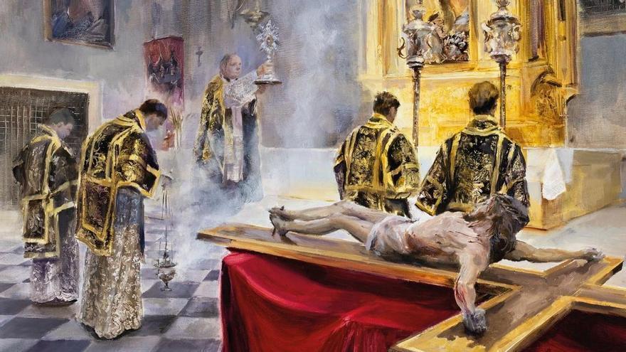 La iglesia de San Bartolomé, en Murcia, fue escenario este sábado, como es habitual cada año, de la presentación del cartel de la Semana Santa murciana de 2026, del que es autor el pintor Carlos Montero Gil. El artista se inspiró, para hacerlo, en una de las tallas que integran el desfile del Santo Sepulcro, que procesiona en uno de los cortejos sobrios que recorren cada Viernes Santo por la tarde la ciudad de Murcia, horas después de que brille (y se recoja) el esplendor de ‘La mañana de Salzillo’.