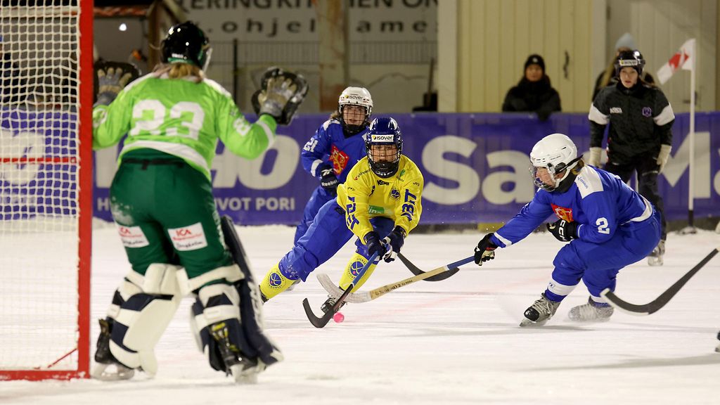 Suomen naisten jääpallomaajoukkueen maalitili jäi avaamatta myös neljännessä ottelussa Porin MM-kotikisoissa, kun joukkue taipui Ruotsille välierässä selvästi 0–9.