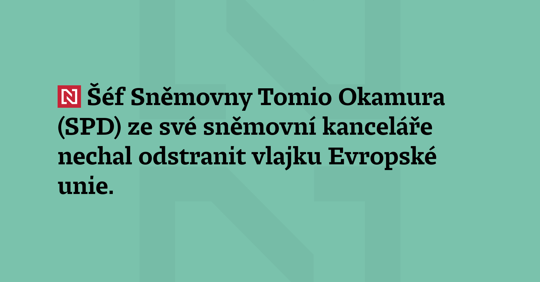 Šéf Sněmovny Tomio Okamura (SPD) ze své sněmovní kanceláře nechal odstranit vlajku Evropské unie. Oznámil to v krátkém videu na sociálních sítích s tím, že se jednalo pouze o relikt po jeho předchůdkyni Markétě Pekarové Adamové (TOP 09).