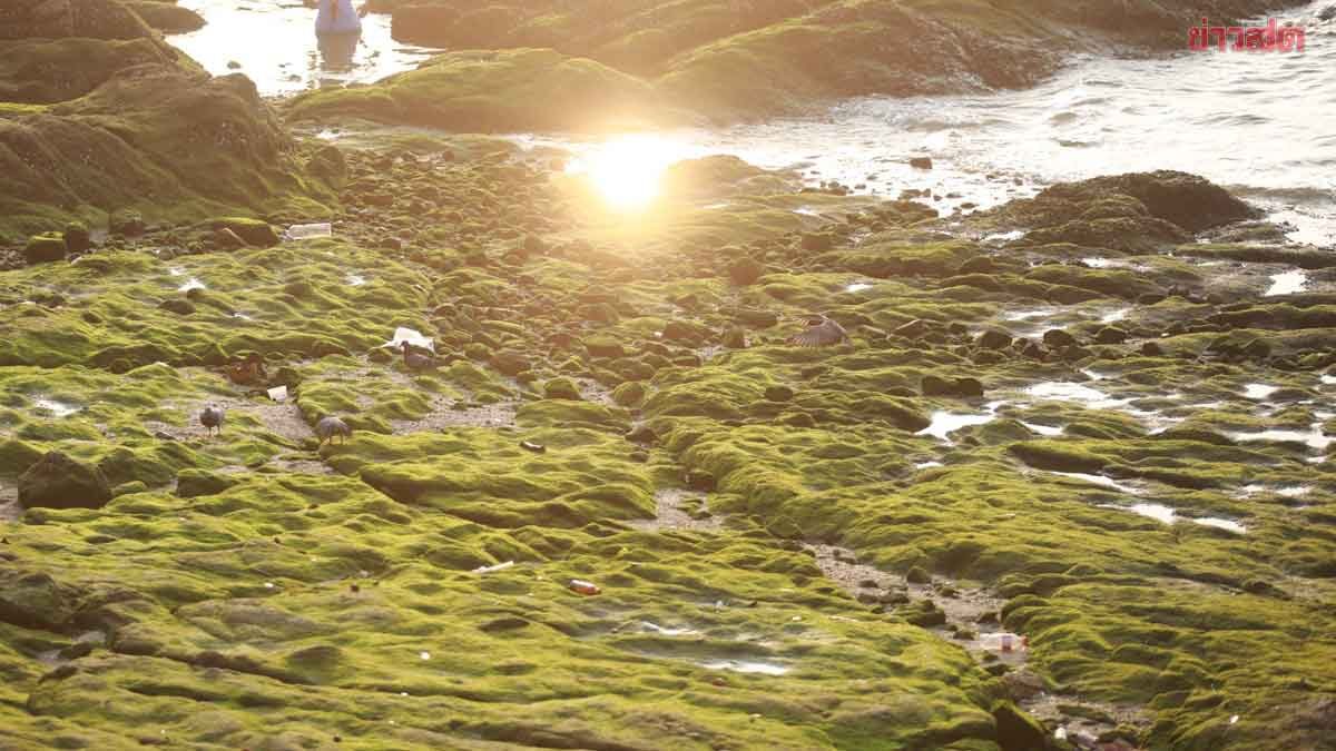 ฮือฮา ตะไคร่น้ำสีเขียว ปกคลุมทั่วโขดหิน แหลมบาลีฮาย 1 ปีมีเพียงครั้งเดียว