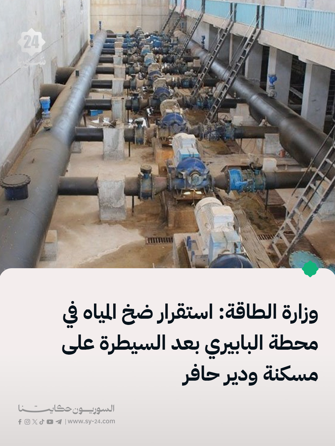 وزارة الطاقة: أعادت مديرية الموارد المائية في حلب تنظيم وتشغيل محطات الضخ الرئيسية بعد تحرير مسكنة ودير حافر من قوات قسد. محطة البابيري، الأكبر في الشرق الأوسط، عادت للعمل بشكل مستقر بقدرة ضخ تبلغ 90 متراً مكعباً في الثانية. المحطة تؤمّن مياه الري لـ 72 ألف هكتار وتزوّد نحو 6 ملايين نسمة […] The post وزارة الطاقة: استقرار ضخ المياه في محطة البابيري بعد السيطرة على مسكنة ودير حافر appeared first on SY24 .