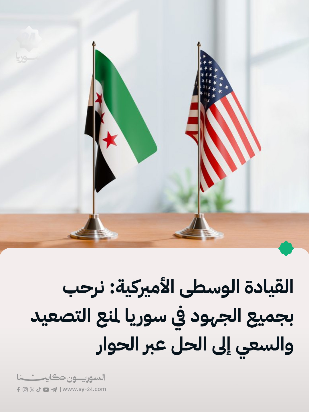 القيادة الوسطى الأميركية: ندعو القوات السورية إلى وقف أي أعمال هجومية في المناطق الواقعة بين حلب والطبقة نرحب بجميع الجهود في سوريا لمنع التصعيد والسعي إلى الحل عبر الحوار ملاحقة داعش بقوة تتطلب تضافر جهود الشركاء السوريين The post القيادة الوسطى الأميركية: نرحب بجميع الجهود في سوريا لمنع التصعيد والسعي إلى الحل عبر الحوار appeared first on SY24 .
