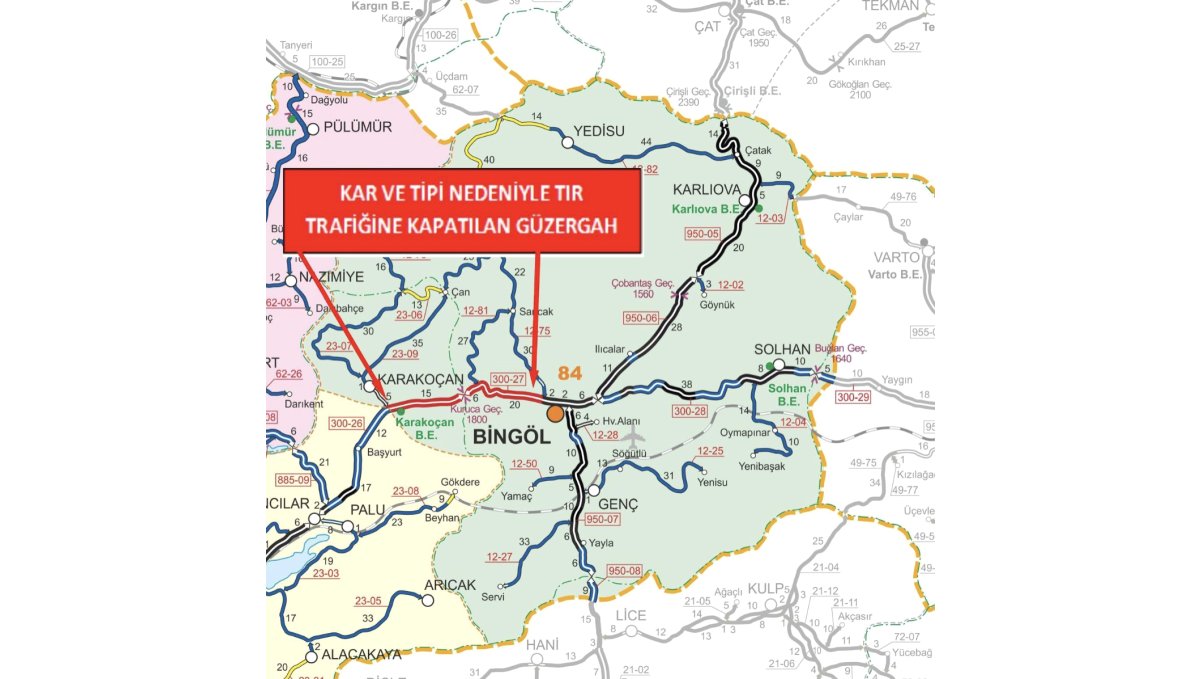 Bingöl-Elazığ karayolunun bir kısmı etkili olan kar ve tipi nedeniyle tır trafiğine kapatıldı.