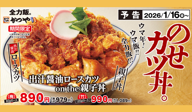 アークランドサービスホールディングス株式会社の⼦会社、とんかつ専⾨店「かつや」を展開している株式会社かつやは、国内「かつや」にて「出汁醤油ロースカツ on the 親子丼」「出汁醤油カツ on the 親子鍋定食」を2026年1月16日(金)より期間限定で販売開始。 かつやの2026年一発目の期間限定メニューは、親子丼の上にロースカツをのせた、その名の通り『出汁醤油ロースカツ on the 親子丼』です。 2026年は午(ウマ)年。新年... The post 親子丼の上にロースカツ!かつや『出汁醤油ロースカツ on the 親子丼』販売開始! first appeared on 福岡のニュース .