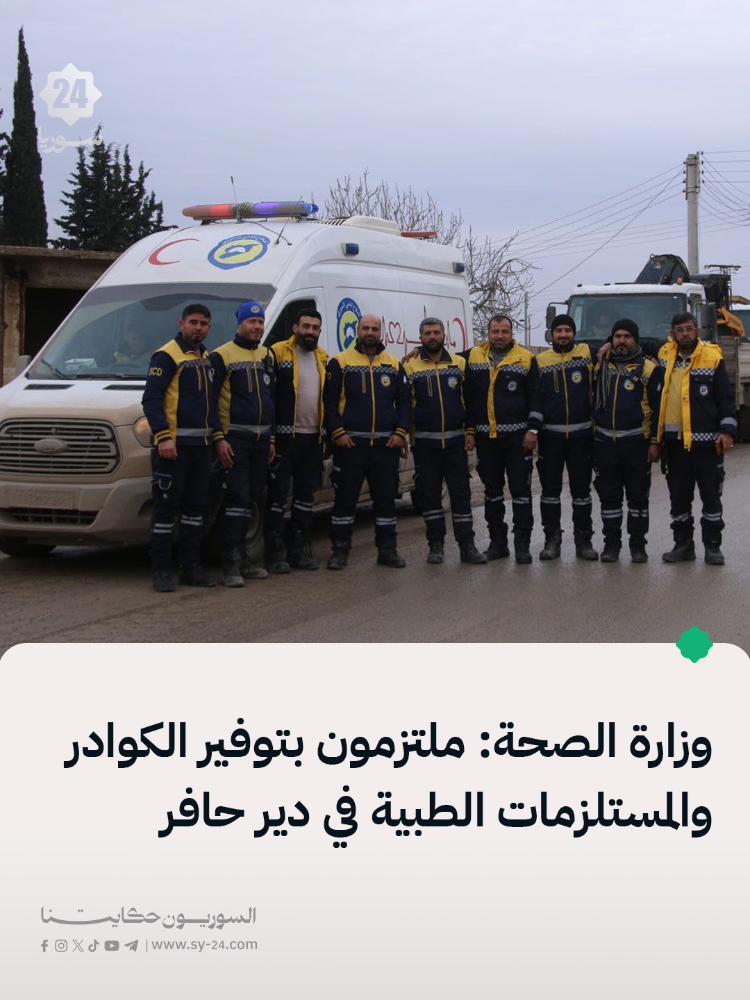 وزارة الصحة: مديرية صحة حلب تبدأ استلام المراكز الصحية في مدينة دير حافر بريف حلب الشرقي. يتم تسيير عيادات متنقلة وتجهيز سيارات إسعاف كإجراء إسعافي عاجل لتأمين التغطية الصحية الفورية. يتم تقديم الخدمات العلاجية الأساسية بانتظار استكمال أعمال الصيانة والتأهيل للمرافق المتضررة. وزارة الصحة تؤكد التزامها بتوفير الكوادر الطبية والمستلزمات اللازمة في المناطق المحررة. The post مديرية صحة حلب تبدأ استلام المراكز الصحية في مدينة دير حافر بريف حلب الشرقي. appeared first on SY24 .