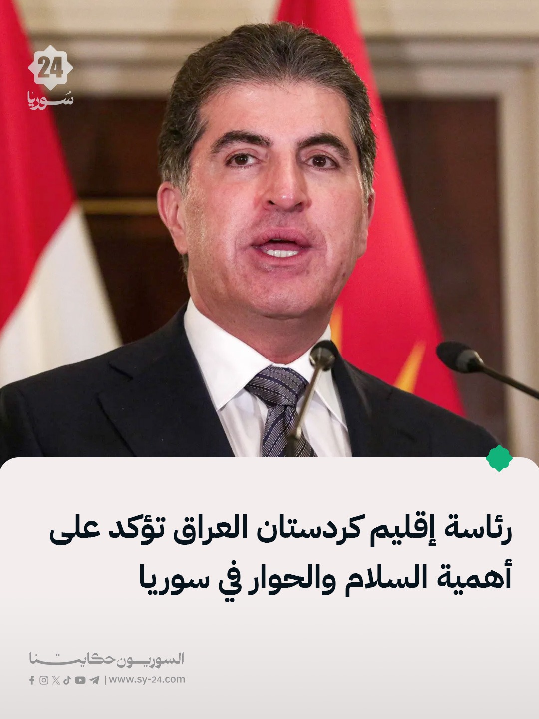 رئاسة كردستان العراق: رئيس إقليم كردستان العراق ومظلوم عبدي أكدا على ضرورة ترسيخ السلام وإنهاء التوتر العسكري في سوريا. الجانبان أكدا على أن الحوار هو الطريق الوحيد للحل وتحقيق التعايش بين مكونات سوريا. بحث الجانبان الخطوات العملية لإعادة الاستقرار في المناطق المتضررة من الحرب والصراعات في سوريا. The post رئيس إقليم كردستان العراق ومظلوم عبدي أكدا على ضرورة ترسيخ السلام appeared first on SY24 .