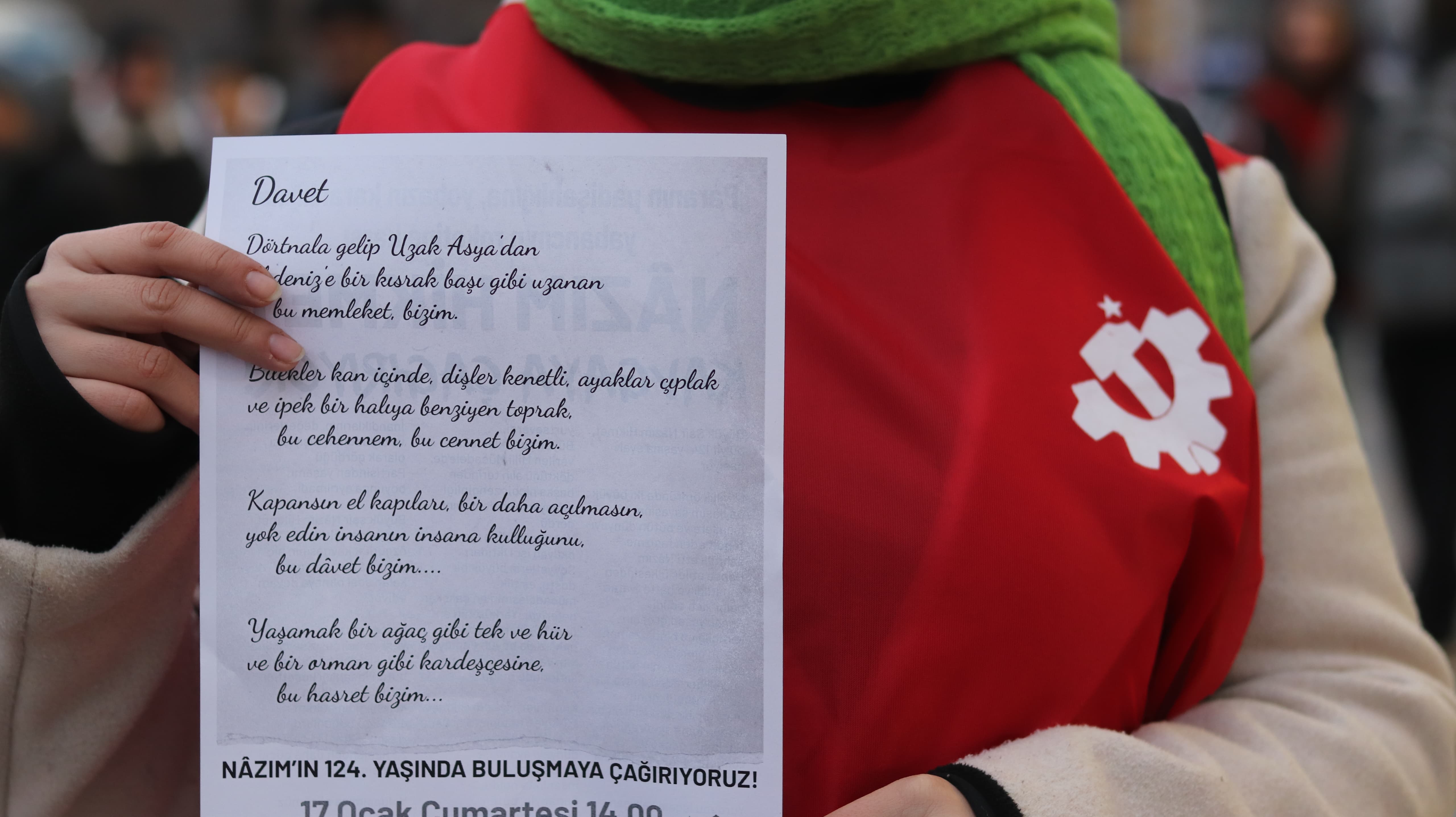 Türkiye Komünist Partisi’nin gençlik örgütlenmesi Türkiye Komünist Gençliği (TKG), Nâzım Hikmet’in 124. yaşını selamlamak için yürüttüğü çalışmalara bu sene kent merkezlerinde, lise önlerinde Nâzım Hikmet’in şiirlerini içeren bildirilerin dağıtarak başladı. “Nâzım’ın sesini sokaklara taşıyoruz” sloganıyla hafta boyunca yürütülen çalışmaları 16-17 Ocak’ta Ankara, Eskişehir ve İstanbul’da düzenlenen buluşmalar takip etti. “Paranın padişahlığına, yobazın karanlığına, yabancının roketine karşı Nâzım Hikmet kavgaya çağırıyor” başlıklı etkinlikler kapsamında gençlerden oluşan korolar ve müzik grupları sahne alırken tiyatro oyunları ve folklor gösterileri sergilendi. Etkinlikler kapsamında Ankara’da akademisyen Gözde Somel, İstanbul’da ise yönetmen Çağrı Kınıkoğlu ve akademisyen yazar Kaya Tokmakçıoğlu eşliğinde Nâzım Hikmet’in yaşamı ve mücadelesi ele alındı. Eskişehir Eskişehir Ankara İstanbul İstanbul