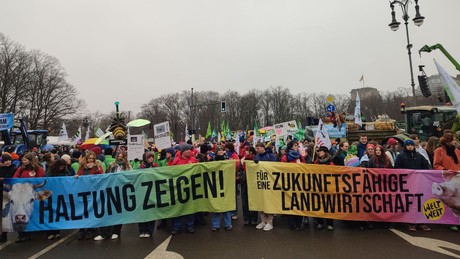 Rund 8000 Teilnehmer setzten sich auf der 16. "Wir haben es satt" - Demonstration für gesunde Nahrungsmittel und den Fortbestand der bäuerlichen Landwirtschaft ein. Die Existenz der Bauern ist sowohl durch das Mercosur-Abkommen, als auch durch die deutsche Agrarpolitik immer mehr bedroht.