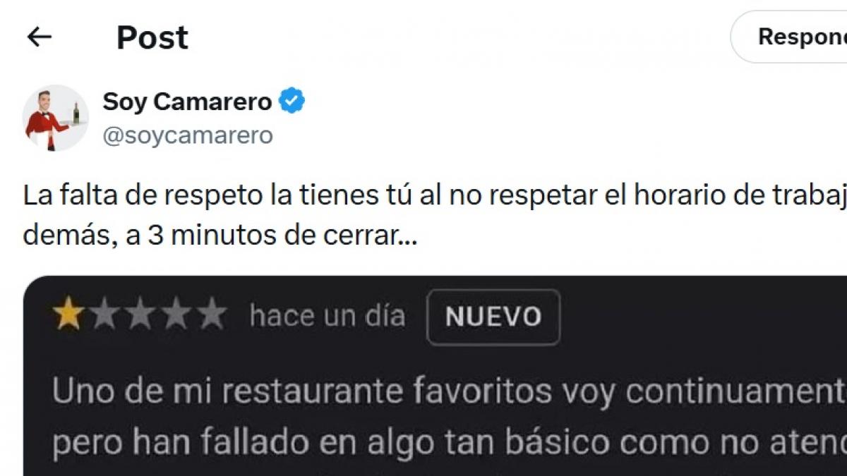 Un cliente va a un restaurante, no le atienden al faltar tres minutos para cerrar y le lanzan una réplica digna de debate
