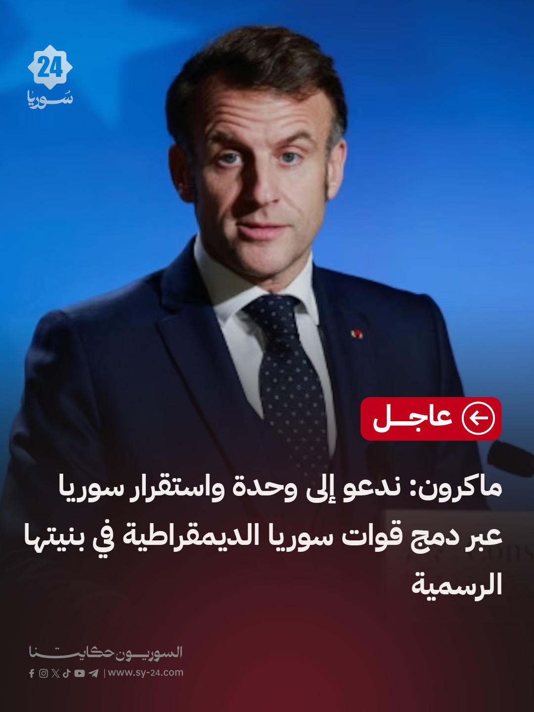 الرئيس الفرنسي إيمانويل ماكرون: ندعو إلى وحدة واستقرار سوريا عبر دمج قوات سوريا الديمقراطية في بنيتها الرسمية، وليس عبر الحرب ضد من حاربوا داعش. تطالب فرنسا بوقف فوري للحملة العسكرية التي تشنها السلطات السورية، وتحذر من عدم قدرة فرنسا وأوروبا على دعم استمرار هذا النهج. تؤكد فرنسا أن التوصل إلى اتفاق شامل في سوريا ممكن، […] The post ندعو إلى وحدة واستقرار سوريا عبر دمج قوات سوريا الديمقراطية في بنيتها الرسمية appeared first on SY24 .