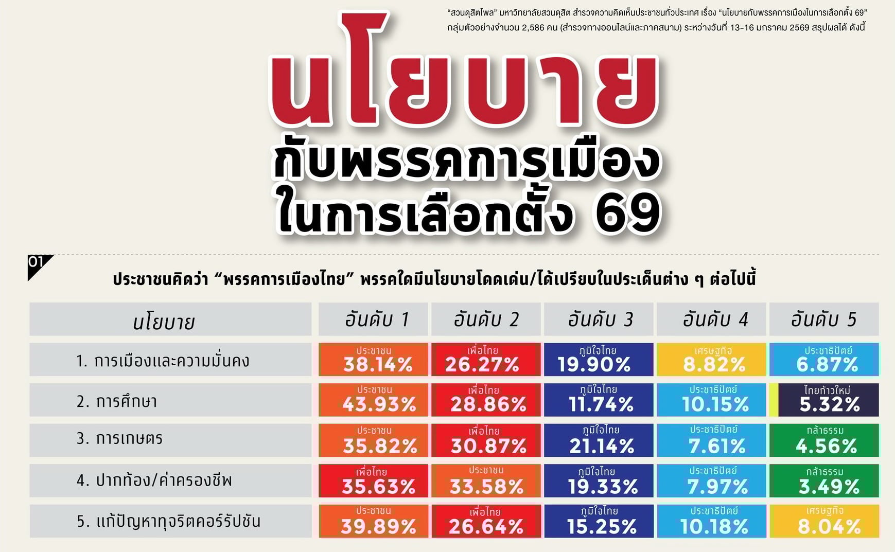 18 ม.ค. 2569 – “สวนดุสิตโพล” มหาวิทยาลัยสวนดุสิต […] The post ‘ดุสิตโพล’ เทียบนโยบายหาเสียงพรรคการเมืองเผย ‘ปชน.’ ได้เปรียบสุด เผย ‘เท้ง’ ตัวเต็งนั่งนายกฯ appeared first on .