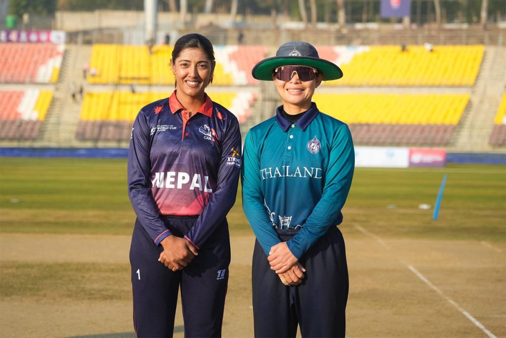 थाइल्यान्डविरुद्ध टस हारेर ब्याटिङ गर्दै नेपाल